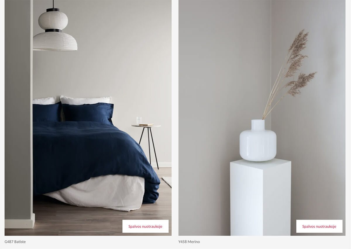 Spalva „Batiste“ (G487) turi šaltą atspalvį, o „Merino“ (Y458) – šiltą. Priklausomai nuo apšvietimo ir aplinkos, šie atspalviai gali atrodyti ryškesni arba blankesni. Jų suvokimui įtakos turi grindų, lubų ir baldų spalva, natūralus bei dirbtinis apšvietimas ir kiti aplinkos veiksniai. Dėl to prieš dažant sienas rekomenduojame atlikti bandomąjį dažymą arba peržiūrėti pasirinktų spalvų pavyzdžius kambaryje, kurį dažysite – taip įsitikinsite, kad atspalvis atitinka Jūsų lūkesčius.